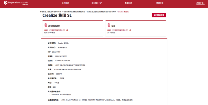 同时,西班牙商业登记文件显示,该境外主体的注册地址位于“POLIGONOINDUSTRIAL(工业区)”,与品牌宣传的“高端实验室”“专业研发基地”形成明显反差,涉嫌虚假宣传。