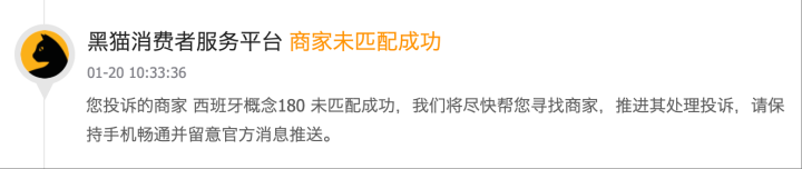 更令消费者维权受阻的是“身份匹配难题”。曹女士在黑猫投诉平台提交投诉后,收到的系统反馈显示:“您投诉的商家‘西班牙概念180’未匹配成功,我们将尽快帮您寻找商家,推进其处理投诉。”这一情况导致消费者维权陷入“找不到责任主体、无法精准维权”的困境。