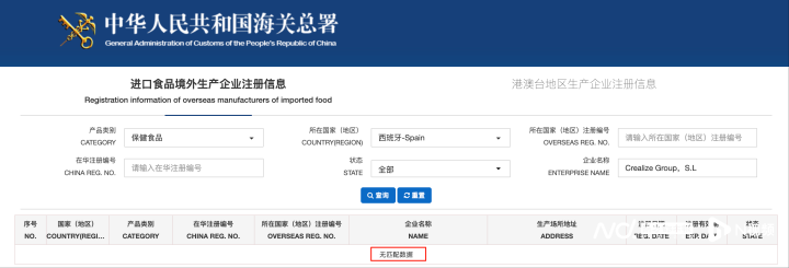 海关总署官网显示,西班牙Crealize公司未在海关总署进口食品境外生产企业注册名单内。