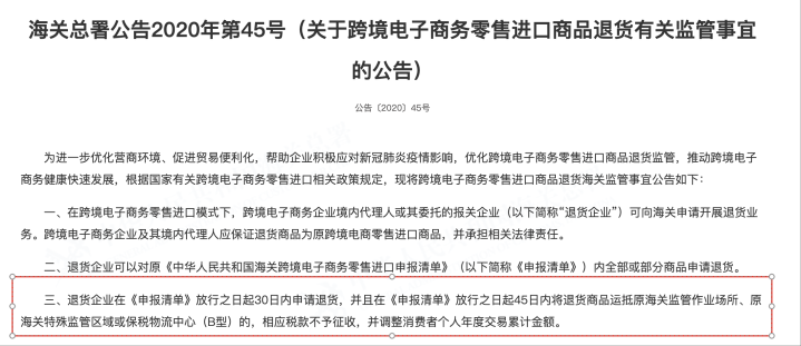 海关总署公告2020年第45号(关于跨境电子商务零售进口商品退货有关监管事宜的公告)。