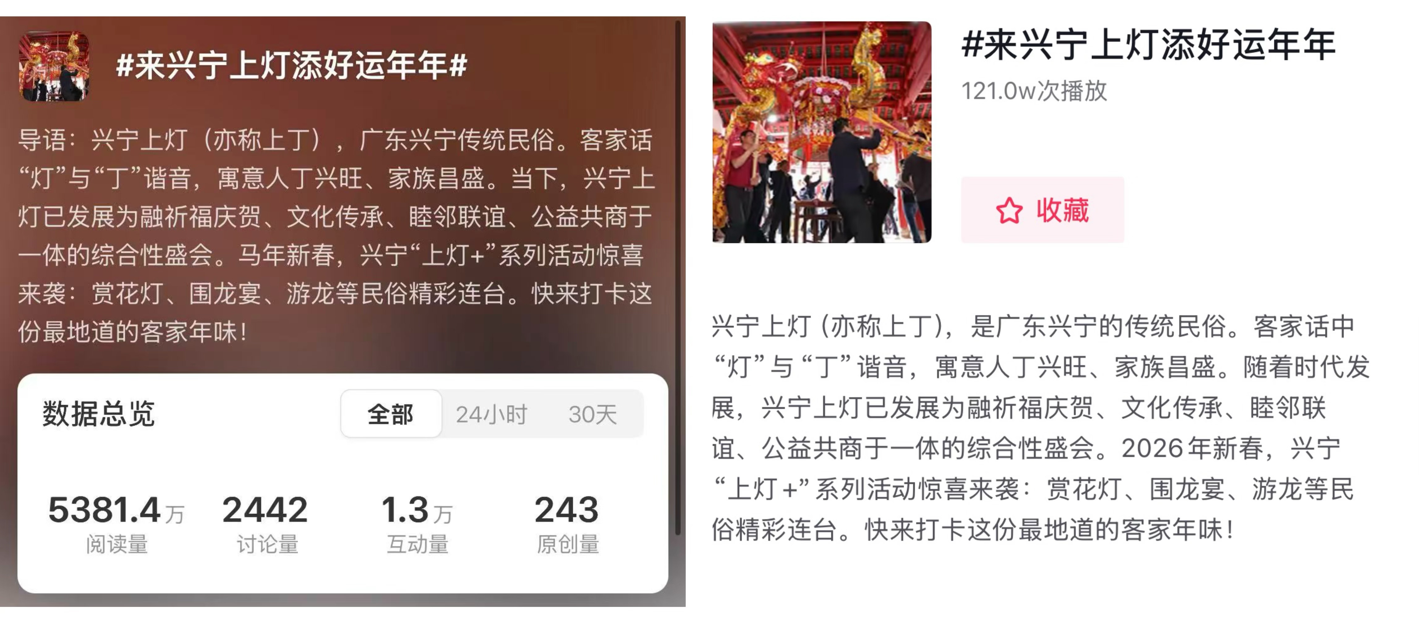 正月前后,广东兴宁传统民俗“上灯”系列活动火热开展,相关话题受到社会广泛关注。截至活动收官,#来兴宁上灯添好运年年#微博话题阅读量已达5381.4万,讨论量2442条,互动量1.3万,原创量243条,成为微博热门话题;同时,抖音话题阅读量达121万。